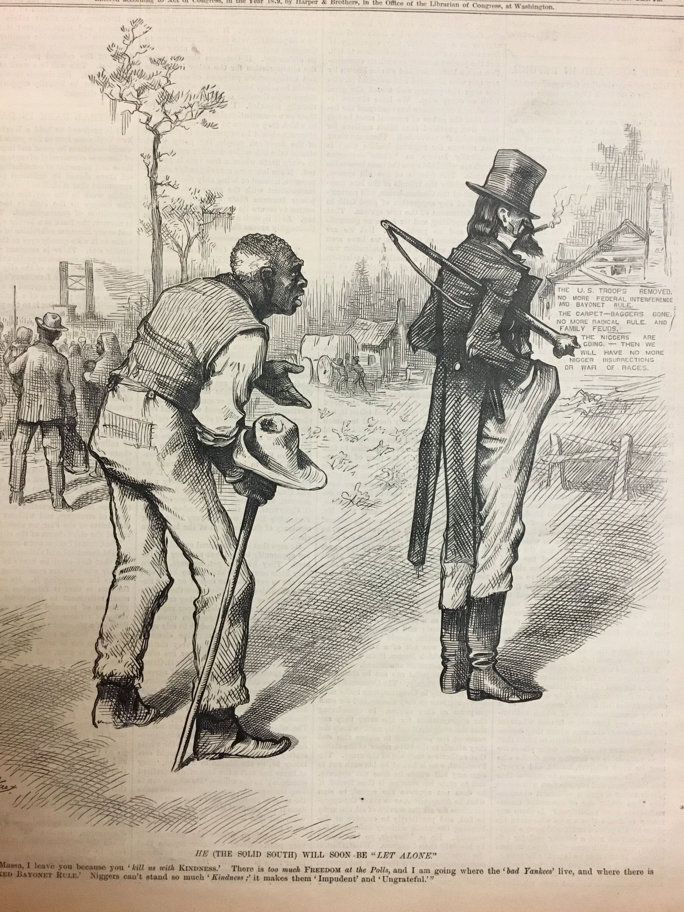 Original Political Cartoon Print "He (The Solid South) Will Soon Be Let Alone" (Reconstruction Period) by Thomas Nast, Harpers Weekly April 26, 1879, 11x16 in, Excellent Condition!