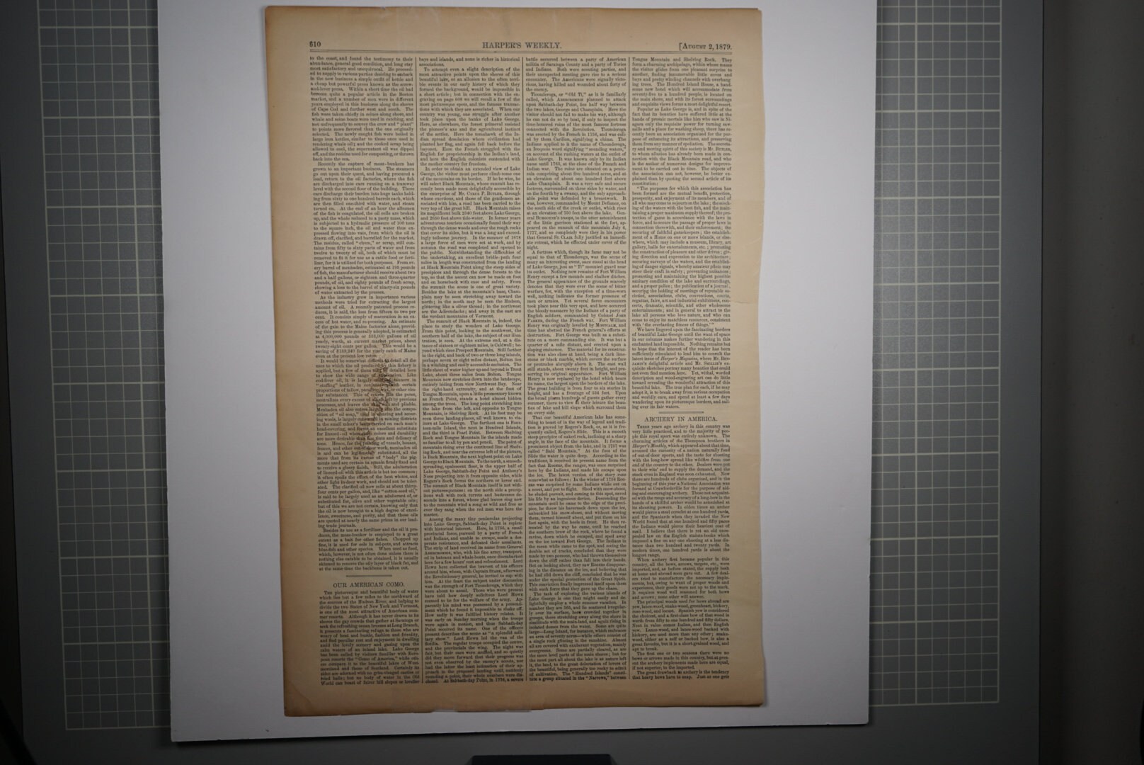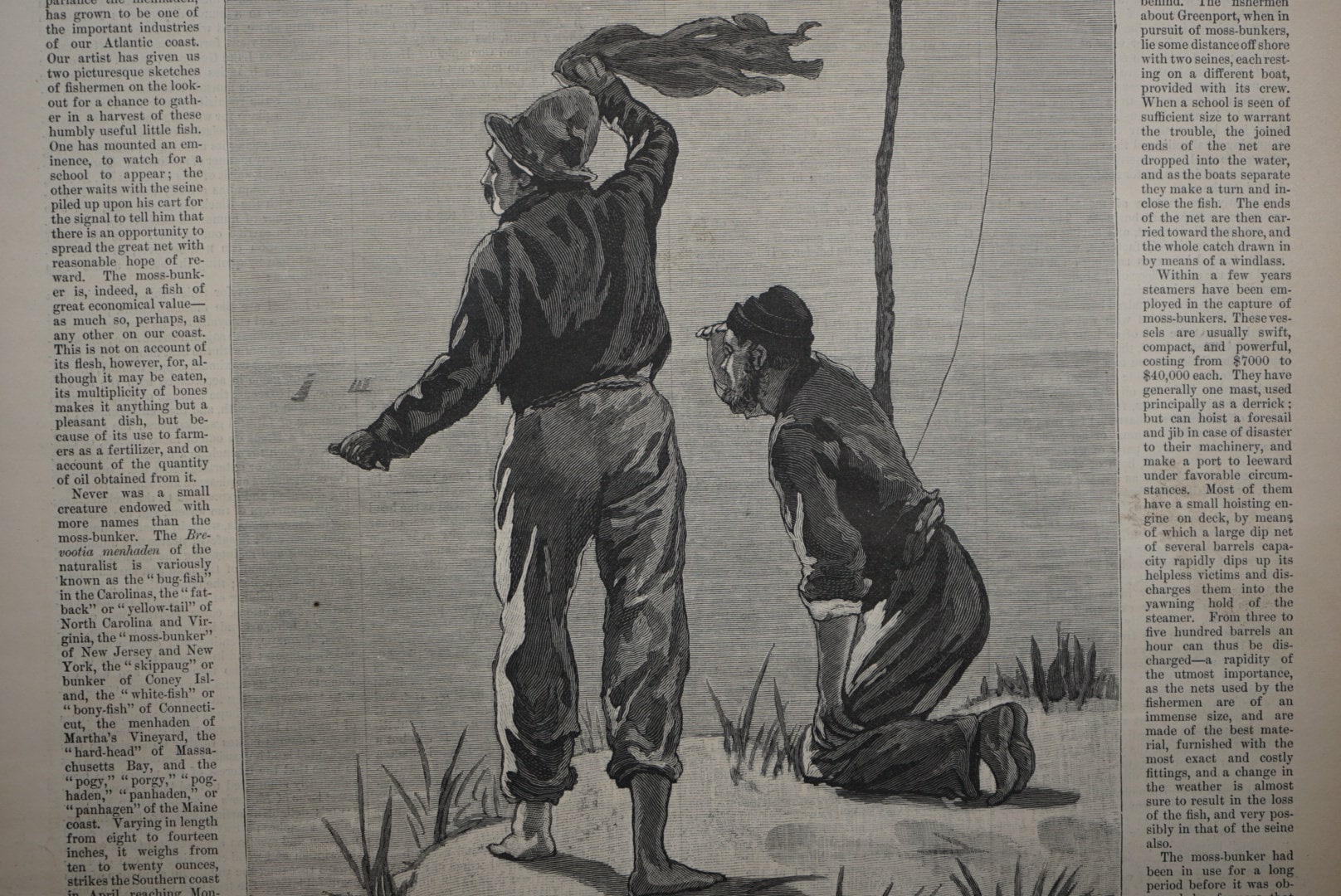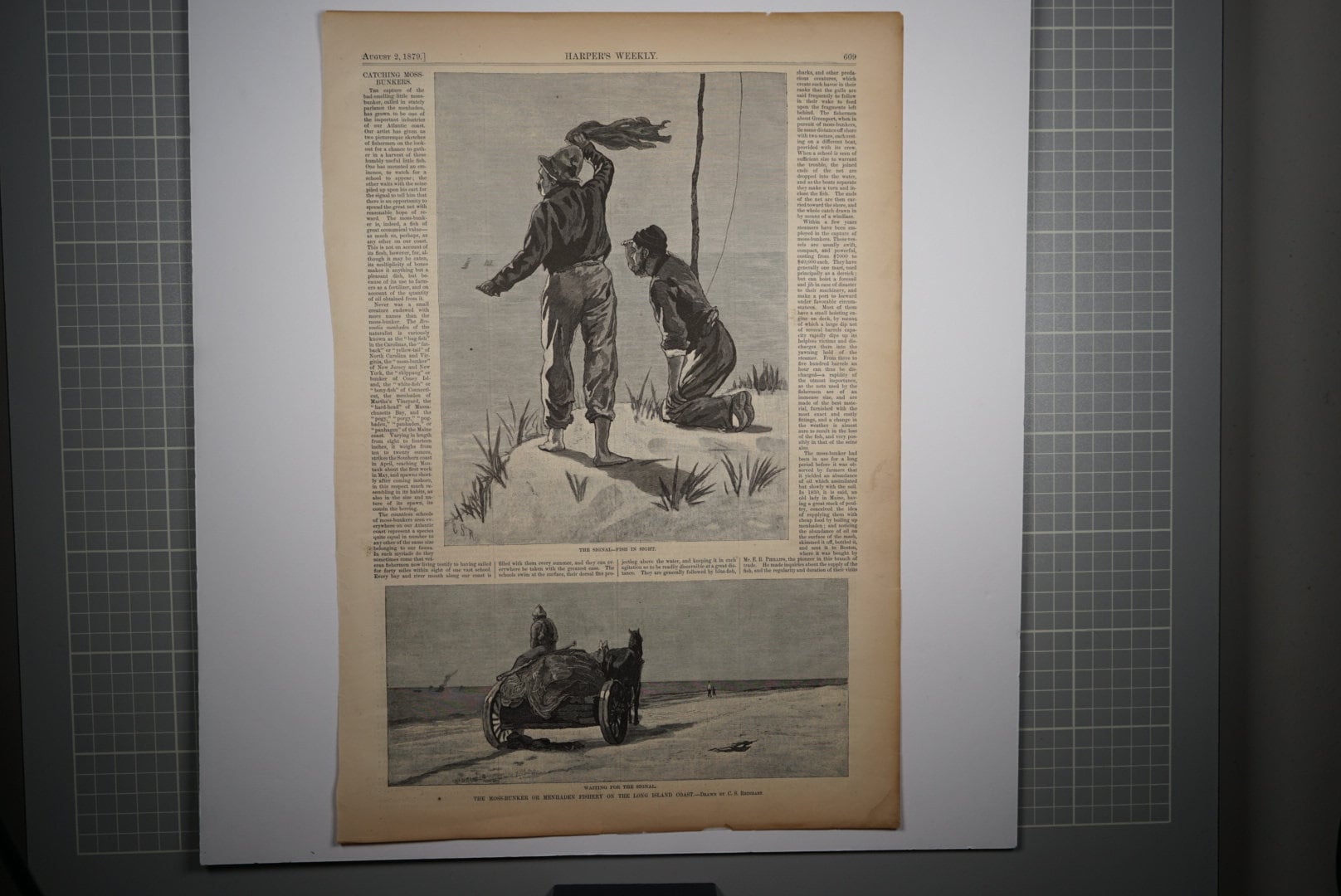 These vintage woodblock prints and accompanying article were originally featured in Harper’s Weekly Newspaper in 1879 and are based on drawings by Charles Stanley Reinhart, an American illustrator and painter. The article and prints detail the process of sighting and catching the moss-bunker or menhaden fish, which was an important industry along the Atlantic Coast at the time. Article on front and back side. Good condition. Dated August 2, 1879. 15.75x10.75”